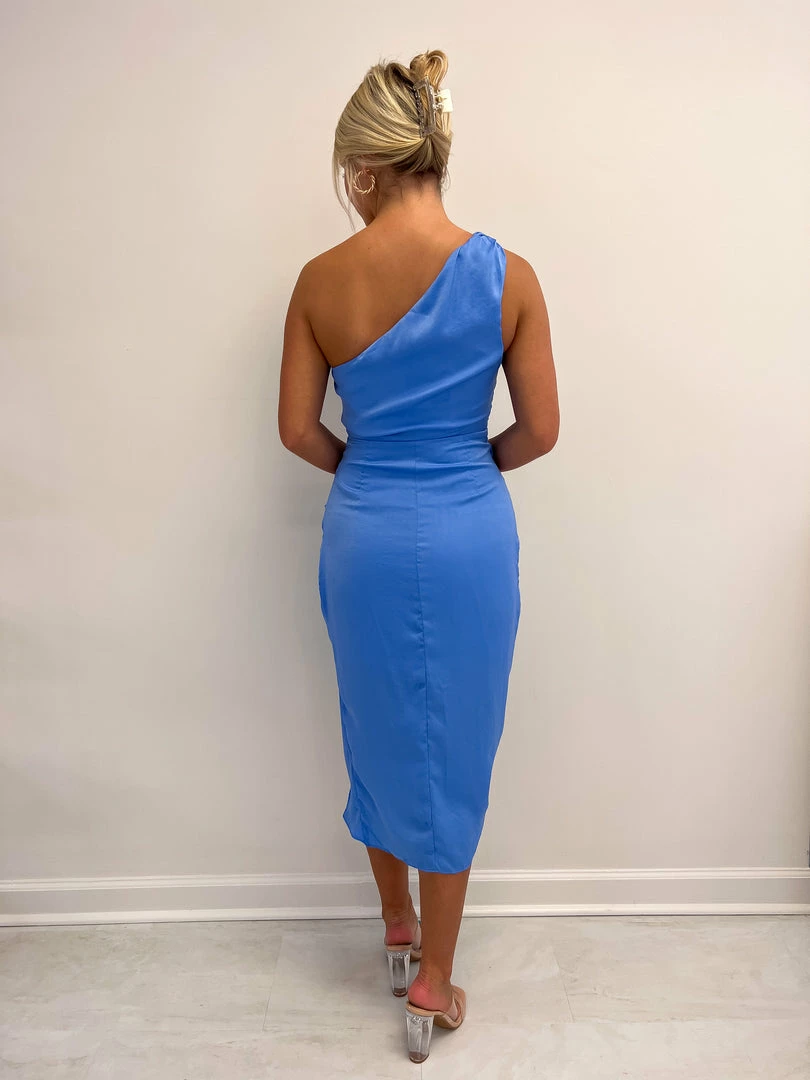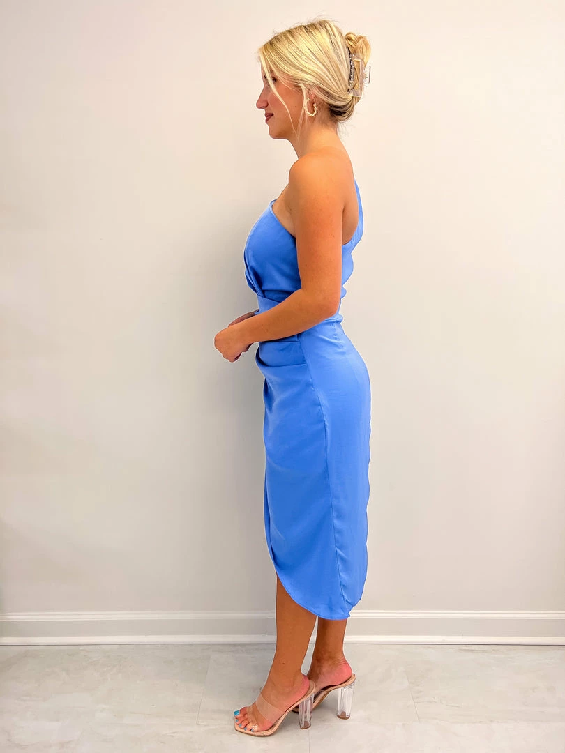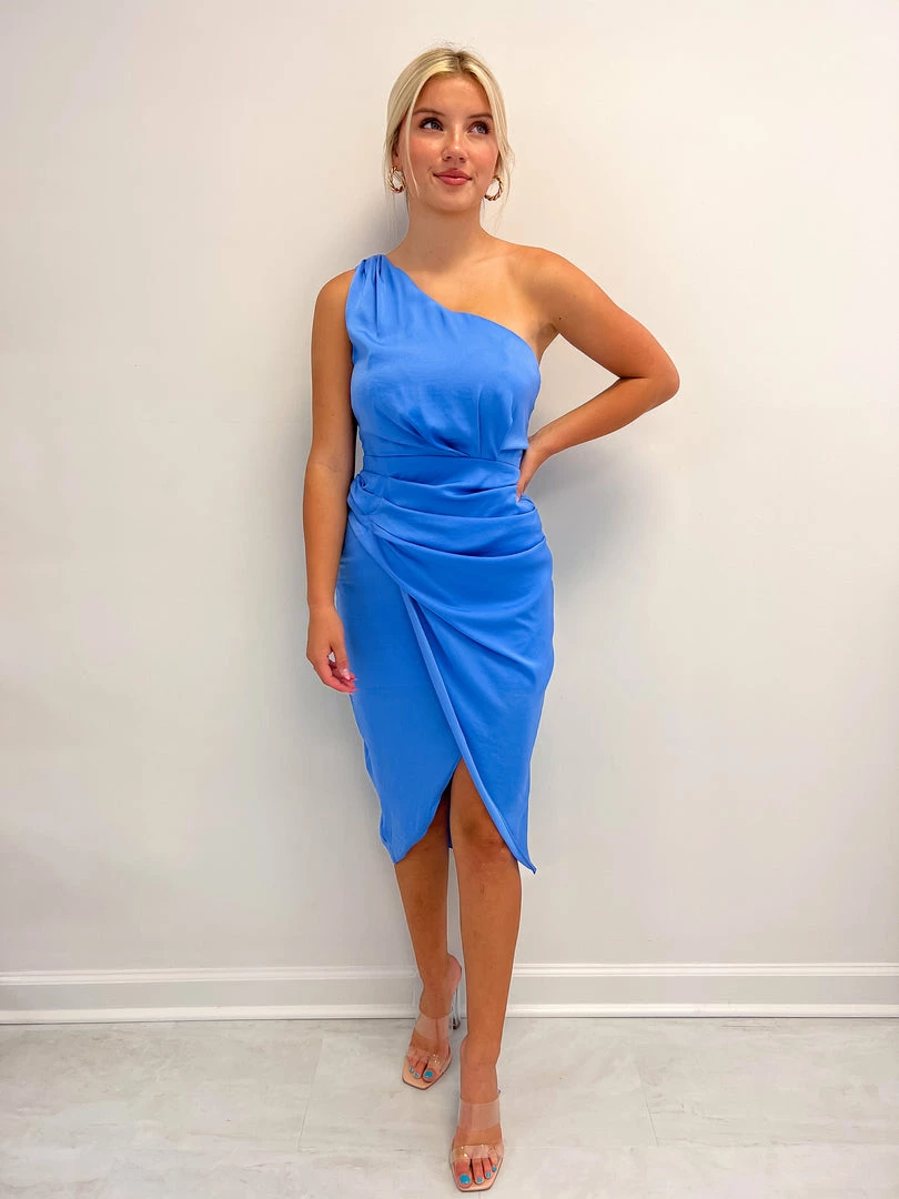- Blue one shoulder wrap dress