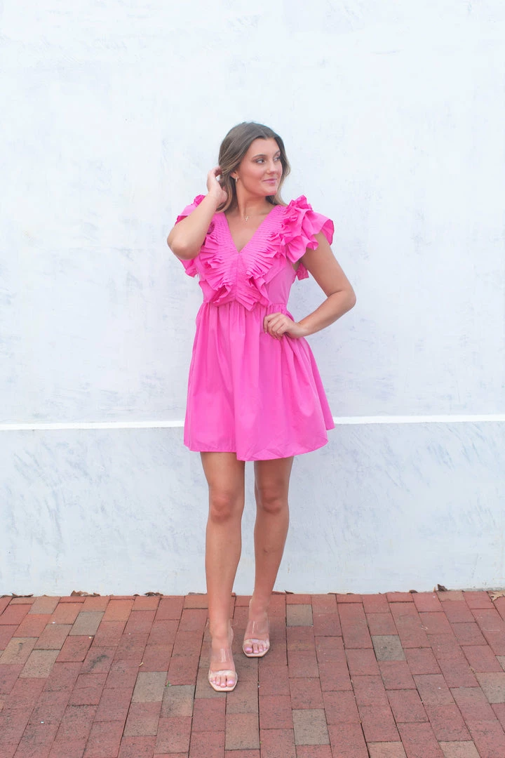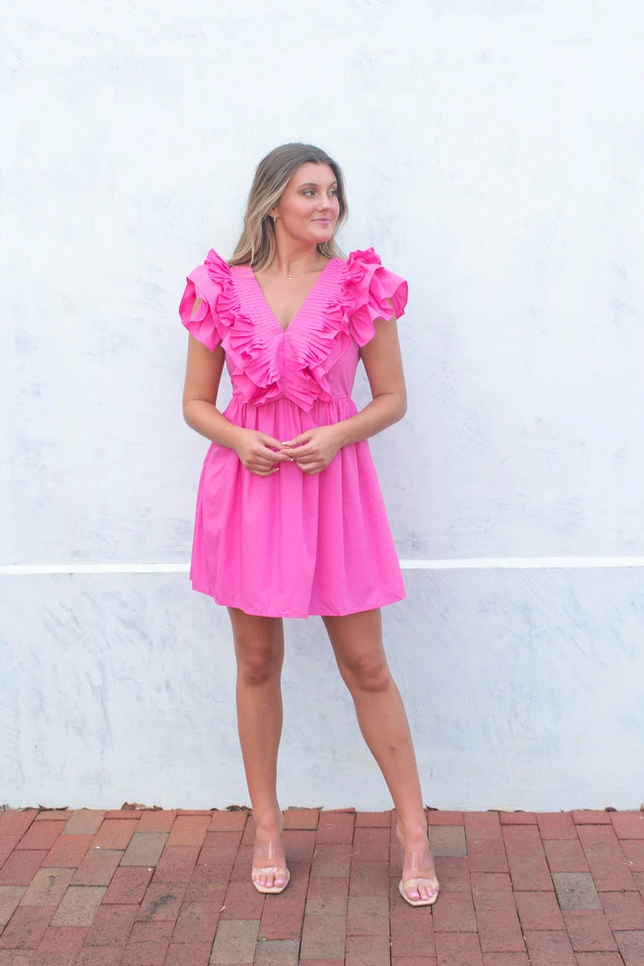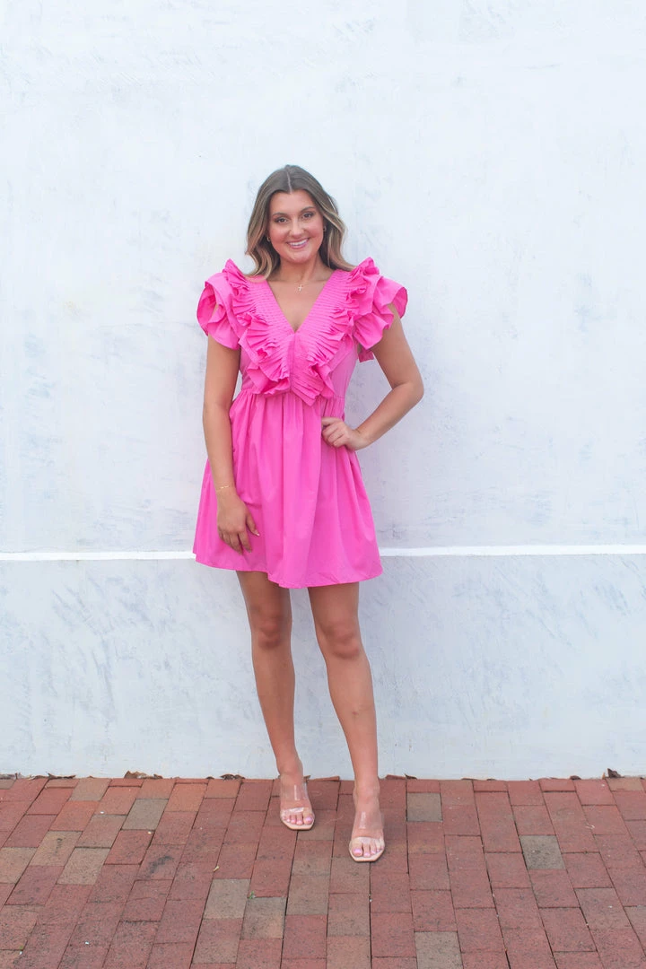 - Pink v-neck featuring pleats and ruffle detail at neckline and sleevesย