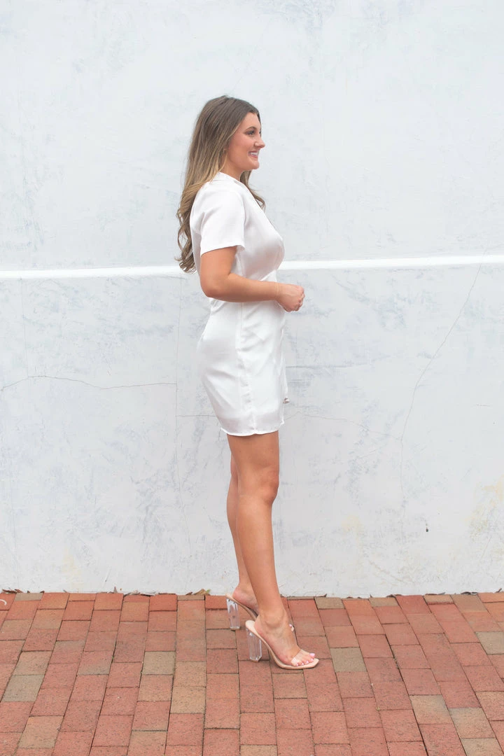 - White satin short sleeve collared dress featuring tulip hem. Elastic at back. Lined. Woven. Non-sheer. Lightweight.
