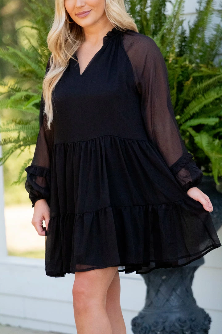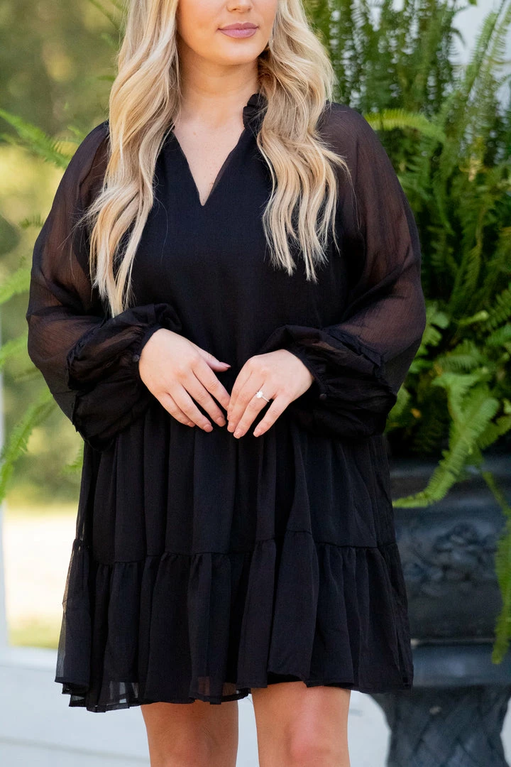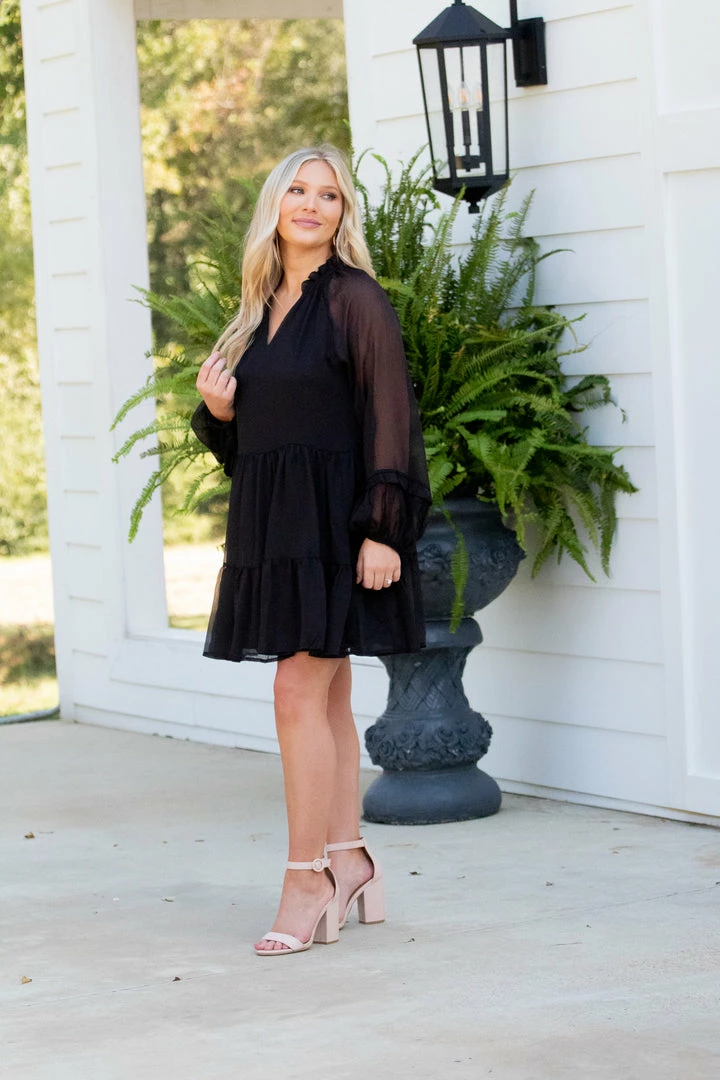 - Long sleeve chiffon swing dress with ruffle detail