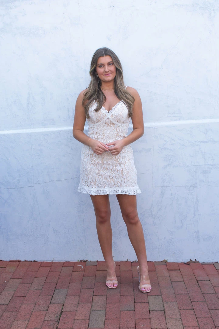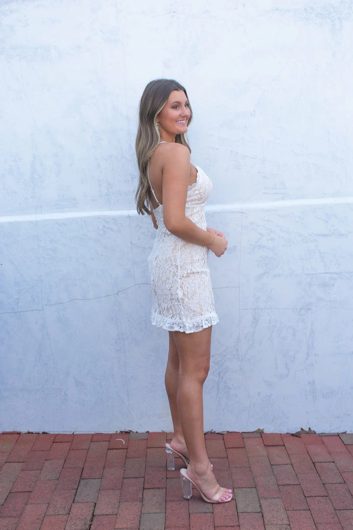 - White sleeveless lace dress