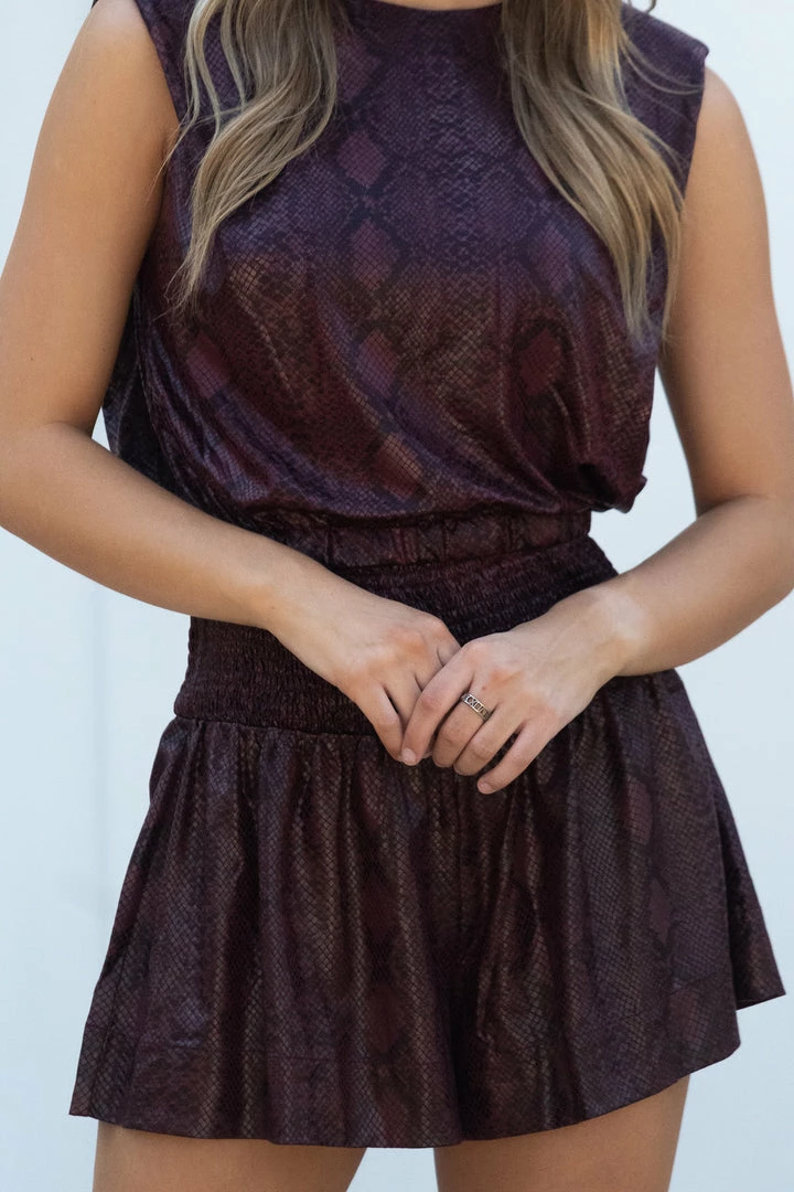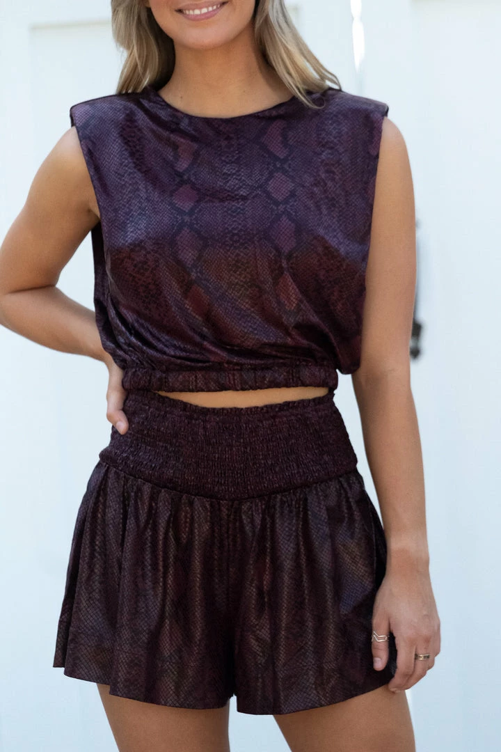 - Maroon snake print shorts with smocked elastic waistband